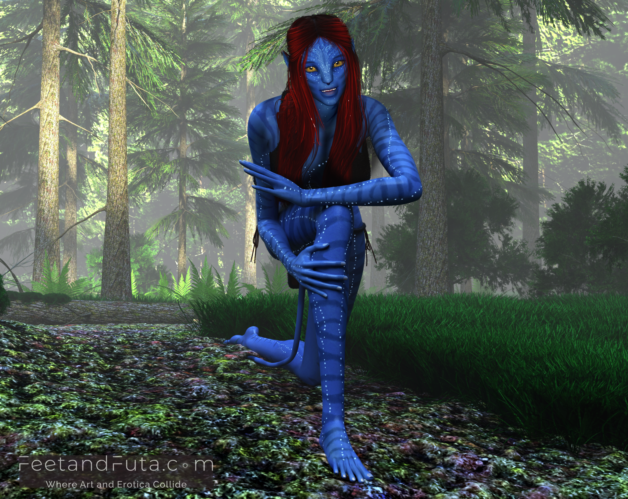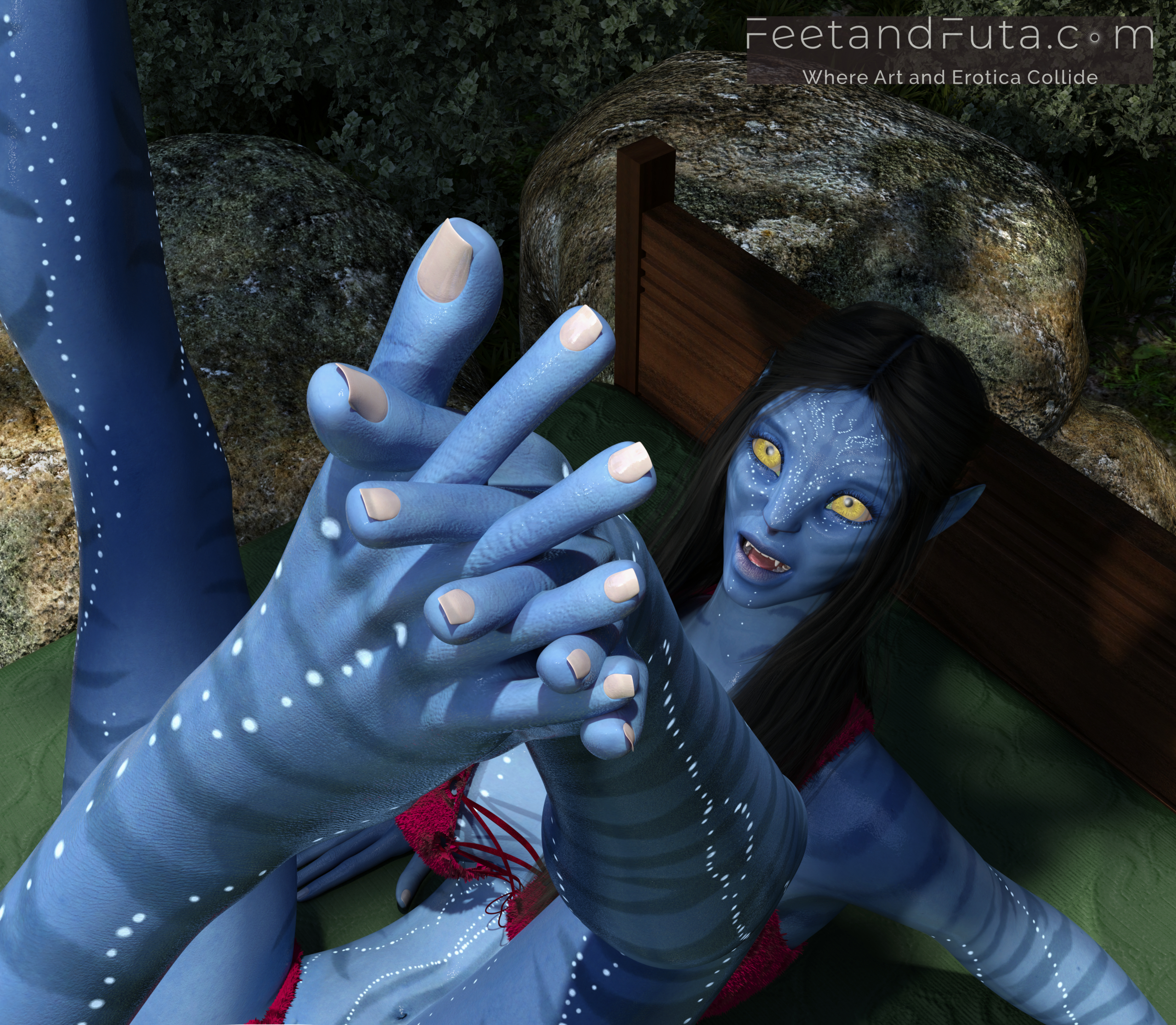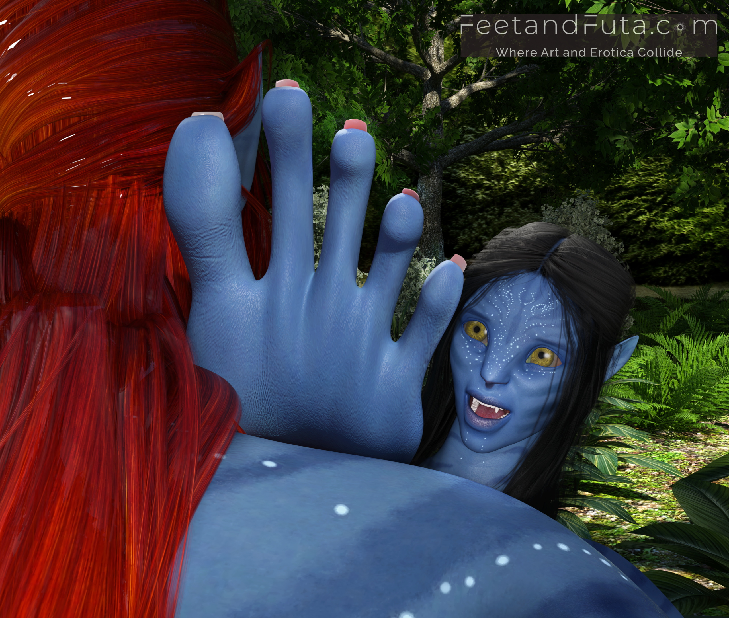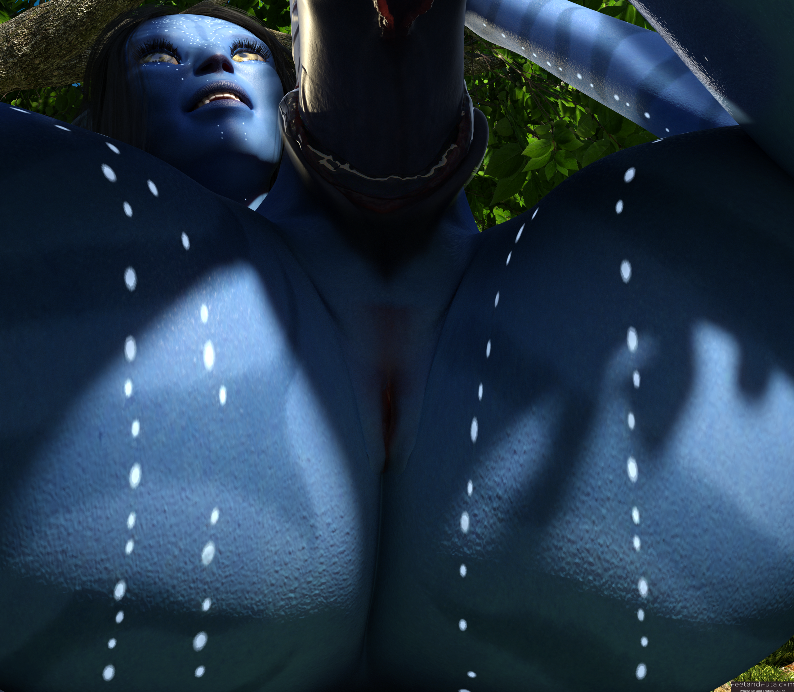 Set in the world of Avatar’s Pandora, this loving and unsanctioned parody pays copious tribute to the intoxicatingly exotic beauty of Na’vi women. Join Sevenari and Eneteke as they celebrate their reunion after a year of pent-up separation in an abandoned shamanic grove where the magic of their sexual alchemy is amplified, and the thin veil between worlds allows us to see them (and vice versa). We meet them individually in the first two chapters and get to gawk as sunlight and shadows dance over their skin, highlighting their unique features and giving us excellent views of their polydactylic (five-fingered) feet.