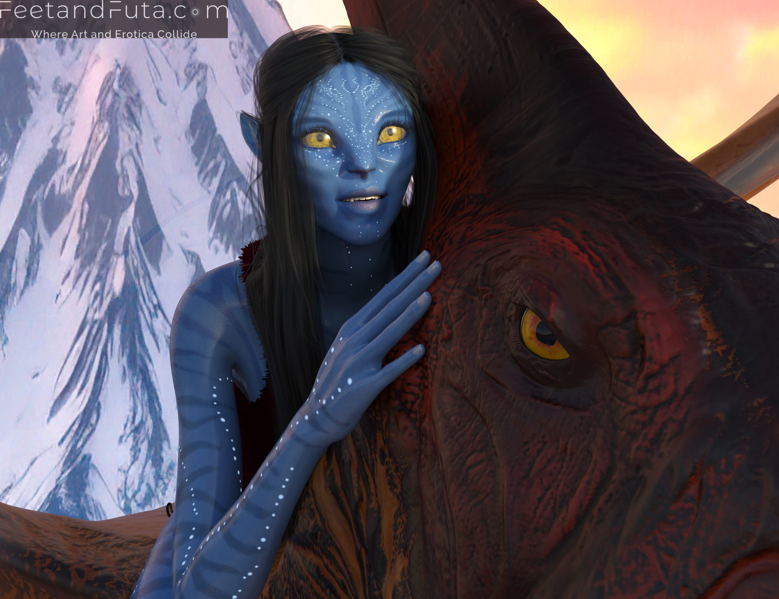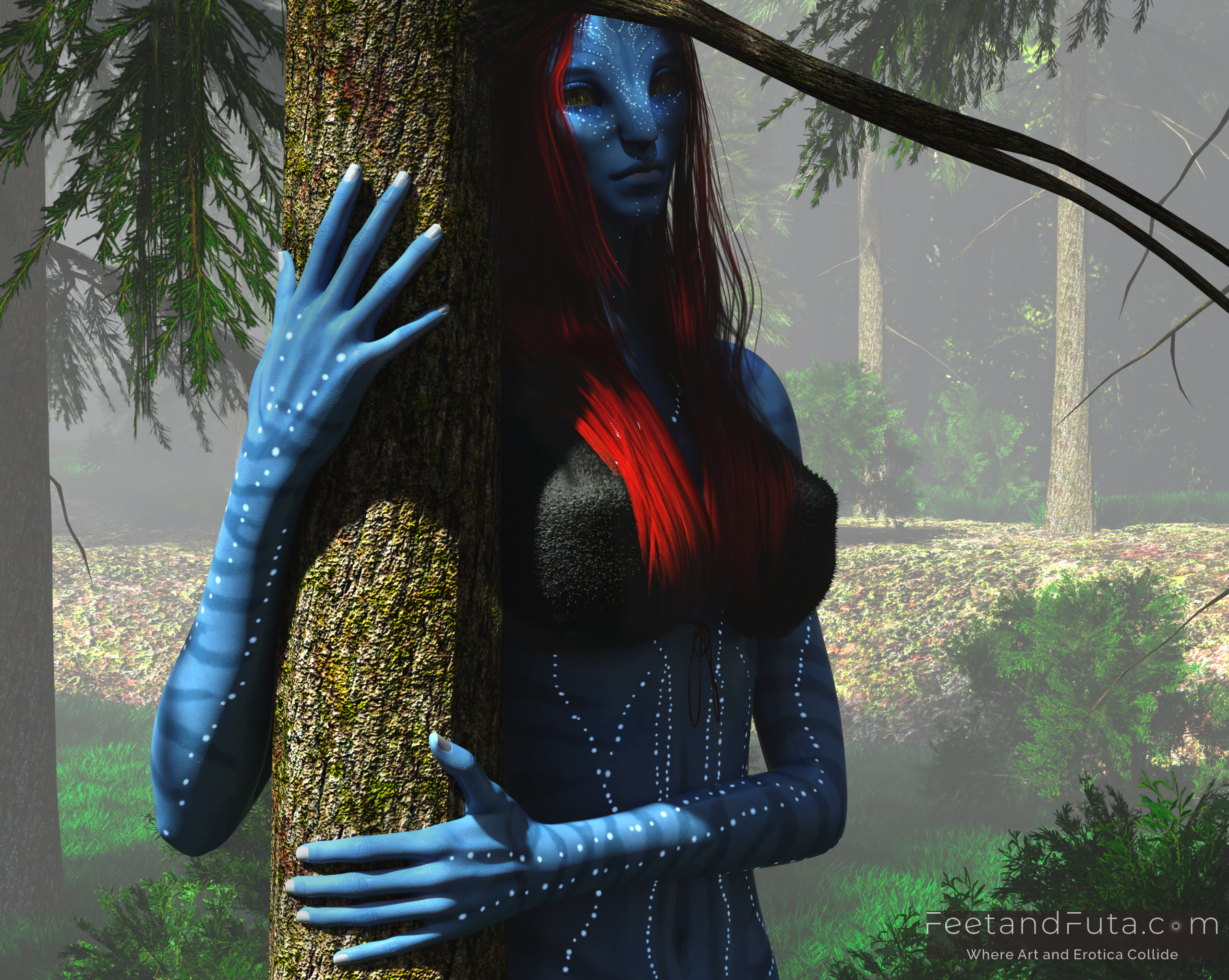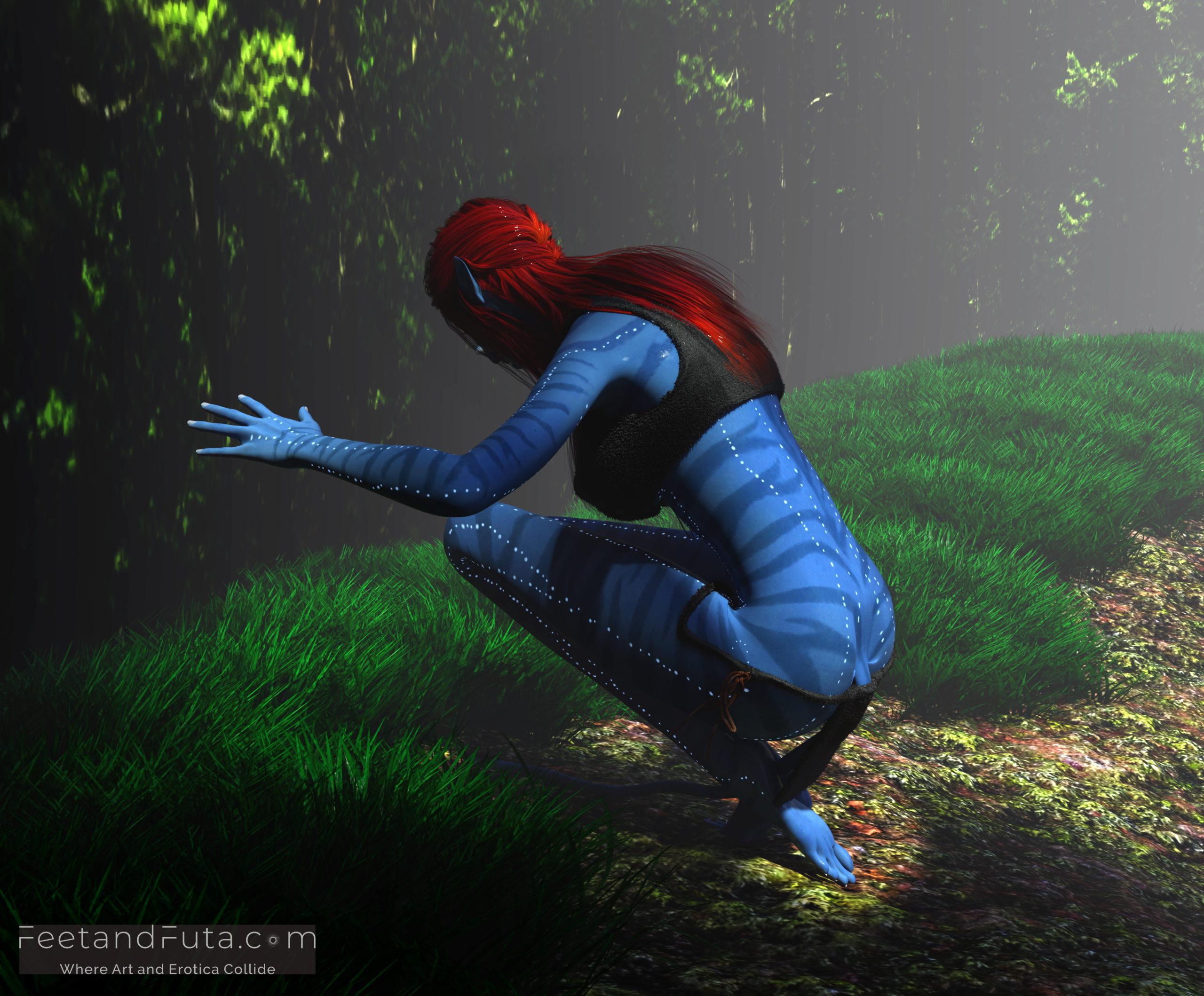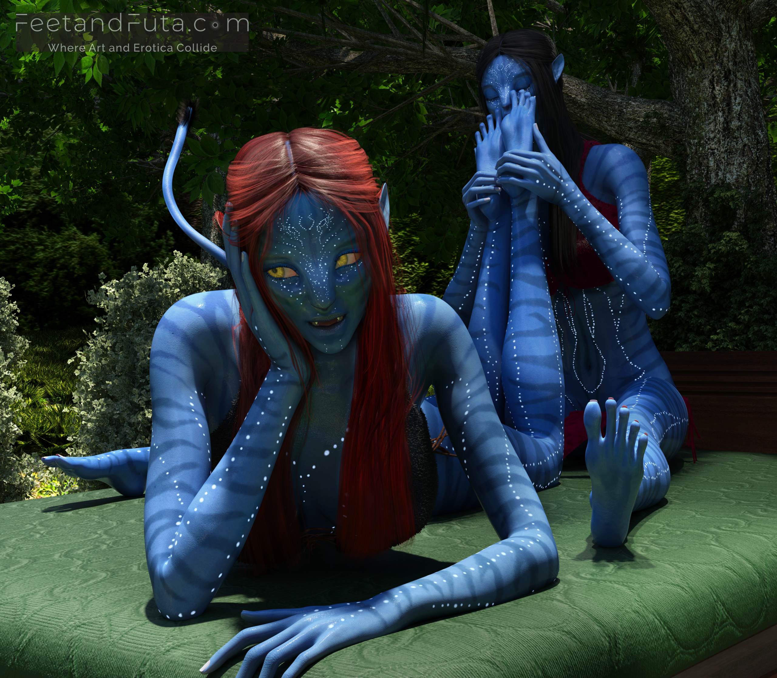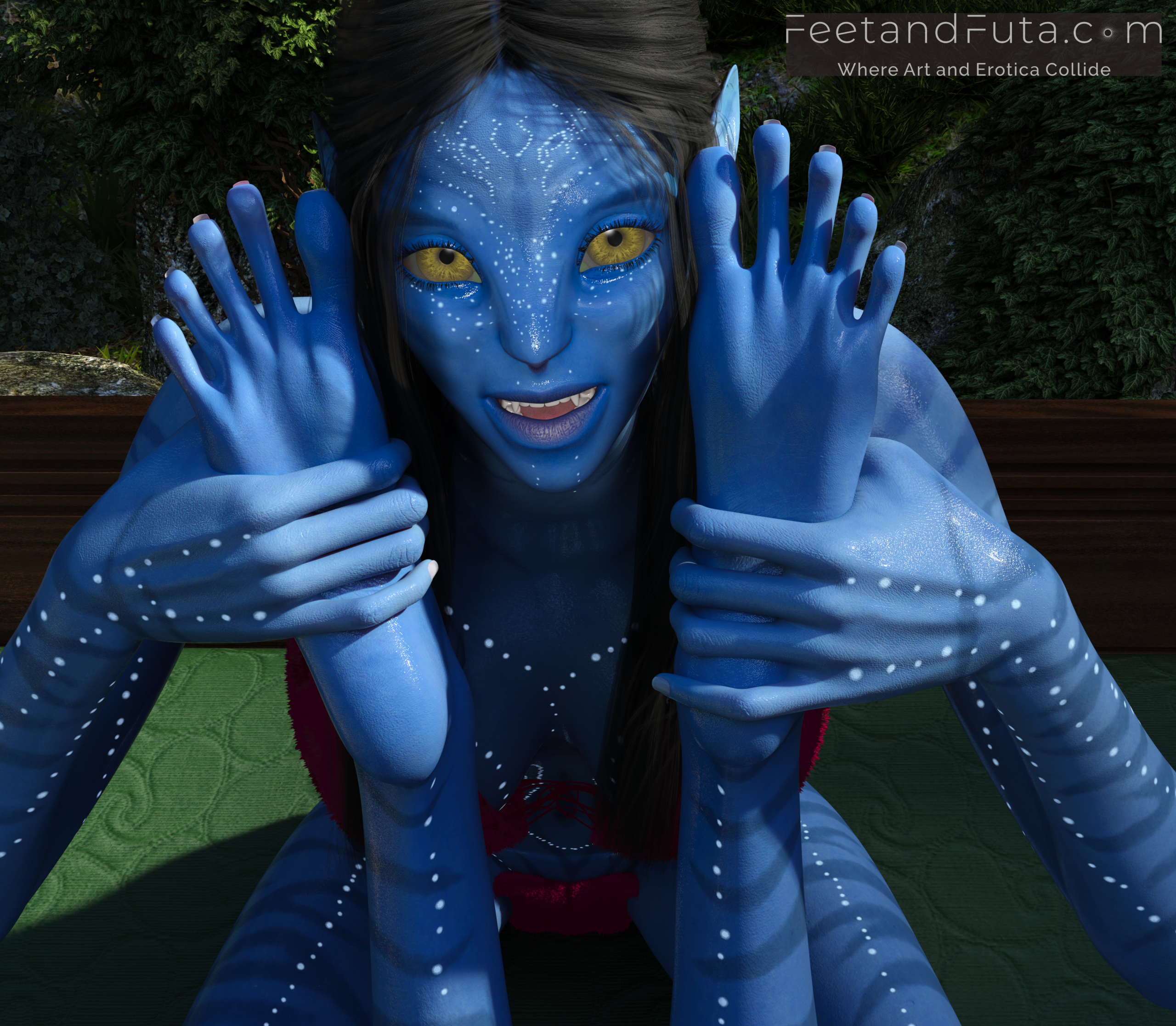 Set in the world of Avatar’s Pandora, this loving and unsanctioned parody pays copious tribute to the intoxicatingly exotic beauty of Na’vi women. Join Sevenari and Eneteke as they celebrate their reunion after a year of pent-up separation in an abandoned shamanic grove where the magic of their sexual alchemy is amplified, and the thin veil between worlds allows us to see them (and vice versa). We meet them individually in the first two chapters and get to gawk as sunlight and shadows dance over their skin, highlighting their unique features and giving us excellent views of their polydactylic (five-fingered) feet.
